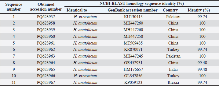 Fig. 3. Phylogenetic tree of H. anatolicum based on partial mitochondrial 16S rRNA sequences. The tree was constructed using the maximum likelihood method (Tamura–Nei model, 100 bootstrap replicates) in MEGA 11. Local sequences (PQ623957–PQ623967) were closely clustered with references from China, Turkey, Pakistan, India, and Russia, showing 99.48%–100% identity. The branch lengths represent the genetic distances. Table 2. Homology sequence identity (%) between local hard ticks and global NCBI-BLAST H. anaolicum and H. excavetum.