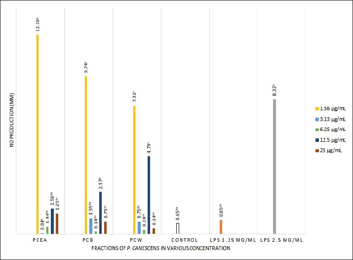 Fig. 3. Effect of three P. canescens leaf fractions at concentrations of 3.1, 6.25, 12.5, 25, and 50 µg/ml on NO production in RAW 264.7 cells. A distinct superscript in each bar (p < 0.05) indicates a significant difference between the means. Effect of P. canescens fractions on RAW 264.7 cell cytokine productionThe impacts of RAW 264.7 cells exposed to PcEA, PcB, and PcW at the concentrations of 12.5, 25, and 50 µg/ml on cytokine production, including TNF-α, IL-6, and IL-10, are shown in Table 2. Table 2 shows that the cultures of RAW 264.7 cells treated with LPS at dosages of 1.25 and 2.5 µg/ml, as well as those incubated with all three P. canescens fractions at concentrations ranging from 12.5, 25, and 50 µg/ml, markedly enhanced the release of the cytokine TNF-α in comparison to the control group (p < 0.05). Meanwhile, the release of IL-6 cytokines by RAW 264.7 cells treated with PcEA at 25 and 50 µg/ml dosages, along with the group stimulated by LPS at 1 µg/ml, showed no significant difference compared with the control cells. Elevated production of the cytokine IL-10 was noted in RAW 264.7 cells treated with PcEA at doses ranging from 12.5 to 50 µg/ml and PcB at concentrations from 12.5 to 25 µg/ml, in addition to RAW 264.7 cells stimulated by 1 and 10 µg/ml LPS. Table 2. Effect of three P. canescens leaf fractions at doses of 12.5, 25, and 50 µg/ml on the production of cytokines in RAW 264.7 cells.