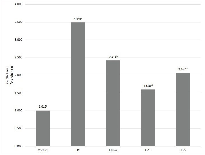 Fig. 6. The alteration of TNF-α, IL-6, and IL-10 mRNA expression in RAW 264.7 cells after PcEA treatment. The gene expression of TNF-α, IL-6, and IL-10 in RAW 264.7 cells treated with PcEA for 6 hours using Reverse Transcription quantitative Polymerase Chain Reaction analysis. Glyceraldehyde 3-phosphate dehydrogenase was used as an internal control for Reverse Transcription Polymerase Chain Reaction.. Fold changes were calculated from 2^-DELTA DELTA Cq. A distinct superscript in each bar (p < 0.05) indicates a significant difference between the means. DiscussionThis study used RAW 264.7 cell viability assays using the MTT assay method to determine nontoxic concentrations of PcEA, PcB, and PcW in RAW 264.7 cells. The MTT assay is based on the principle that mitochondrial dehydrogenase enzymes convert MTT into purple formazan crystals through the action of metabolically active and viable cells (Stockert et al., 2012). Based on the guidelines for cytotoxicity assays using the MTT method, a decrease in cell viability to below 70% of the control indicates that the cells exhibit cytotoxic potential (ISO, 2009). Pratama et al. (2024) reported that the evaluation of the extract concentration, which produces a percentage of live cells >80%, indicates that the extract is not toxic to RAW 264.7 cells, so further testing is warranted. This study showed 100% cell viability in the untreated control group, indicating ideal cell growth conditions and a safe medium for cellular development. For RAW 264.7 cells treated with PcEA, PcB, and PcW at concentrations of 3.1, 6.25, 12.5, 25, and 50 µg/ml, cell viability ranged from 97.88% to 82.39% (Fig. 1). These results indicate that all three fractions are non-toxic to RAW 264.7 cells and can be used for further evaluation within the tested concentration range. This finding is supported by Hikariastri et al. (2019), who reported that treatment doses resulting in cell viability above 80% are deemed safe for subsequent assays using RAW 264.7 cells. Ryu et al. (2019) investigated the anti-inflammatory properties of various herbal plant extracts using the MTT method and determined that extract concentrations with a RAW 264.7 cell viability percentage exceeding 80% are suitable for use in subsequent assays. Innate immune system cells are the first line of defense against foreign pathogens. The rapid response to antigens is a key factor in strengthening innate immunity. Several phagocytic cells, including macrophages, monocytes, and neutrophils, play crucial roles in the innate immune response. Macrophages are an early and essential step in the immune response (Qian et al., 2023). In this study, the neutral red phagocytosis assay was used to evaluate the activation of the immune response induced by P. canescens fractions. The neutral red assay assesses phagocytic activity by quantifying the uptake of neutral red dye by phagocytic cells. Cells engulf antigens during the initial phase of phagocytosis, a process facilitated by increased membrane fluidity and the activation of various membrane-associated proteins. Membrane fluidity is crucial for phagocytic cells to internalize foreign particles. Upon activation, macrophages also initiate the production of several immunomodulatory molecules, including NO, inducible NO synthase (iNOS), cyclooxygenase-2, and pro-inflammatory cytokines (Lee et al., 2022). In vitro studies using the RAW 264.7 cell line to evaluate the phagocytic activity of P. canescens extract have not been conducted. RAW 264.7 cells are frequently used as macrophage models for evaluating in vitro immunomodulatory activity. RAW 264.7 cells closely resemble primary murine macrophages, which are crucial for macrophage maturation (Riastri et al., 2023). Activated macrophages can eliminate pathogens through direct phagocytosis in the innate response. The neutral red absorption test can be used to evaluate the phagocytic mechanism of RAW 264.7 cells (Teng et al., 2015). Dillasamola et al. (2021) determined the phagocytic activity of macrophages in vivo and demonstrated that white mice treated with P. canescens extract at concentrations of 800, 400, and 200 mg/kg BW exhibited significantly higher phagocytic capacity than the control group, which received 0.5% Na CMC (p < 0.05). In another in vivo study, Latief et al. (2023) demonstrated that the administration of methanol and ethyl acetate extracts of P. canescens significantly increased phagocytic activity compared with the negative control group. The results of both phagocytic in vivo assays corroborate those of the in vitro phagocytic assays in this study. The findings obtained in this study corroborate the information regarding the potential bioactivity of sugai leaves in modulating the immune system. NO production was measured using the Griess reagent assay. This method involves the reaction of nitrite, a stable end-product of NO metabolism, with a diazotization reagent to form a transient diazonium salt. This intermediate then reacts with N-naphthyl-ethylenediamine, a coupling agent, to produce a stable, purple azo compound. The intensity of the resulting color allows for the sensitive and accurate quantification of nitrite levels, thereby serving as an indirect measure of NO production (Paul et al., 2021). NO is a lipophilic gas generated from the arginine substrate by the activity of the enzyme NO synthase (Priyanga et al., 2024). NO is crucial for mediating cellular immune signals and exhibits various biological functions, such as immunomodulation, inflammation, and the eradication of microbes and tumors (Cinelli et al., 2020). Macrophages activated by cytokines or microbial antigens, such as LPS, release several effector molecules that can eradicate microbial antigens, one of which is NO (Shreshtha et al., 2018). However, this multifunctional effector molecule has a dual role. It is advantageous and modulates physiological processes within the body at lower concentrations. Conversely, at elevated do