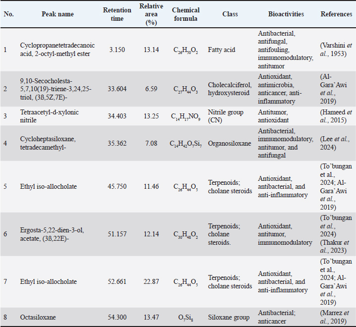 Open Vet. J.. 2025; 15(12): 6856-6871 Open Veterinary Journal, (2025), Vol. 15(12): 6856-6871 Research Article Evaluation of the immunomodulatory properties of Peronema canescens leaf fractions: A molecular and chemical analysisAde Erma Suryani1,2, Khoirun Nisa1, Sri Handayani3, Sri Handyani1, Anastasia Wheni Indrianingsih1, Wafda Naufi Marva Nuzulia4, Hastari Wuryastuty5* and Yanuartono Yanuartono51Research Center for Food Technology and Processing, National Research and Innovation Agency, Yogyakarta, Indonesia 2Doctor of Veterinary Science Program, Faculty of Veterinary Medicine, Gadjah Mada University, Yogyakarta, Indonesia 3Research Center for Pharmaceutical Ingredients and Traditional Medicine, National Research and Innovation Agency, Bogor, Indonesia 4Biology Study Program, Faculty of Mathematics and Natural Sciences, Sebelas Maret University, Surakarta, Indonesia 5Departement of Veterinary Internal Medicine, Faculty of Veterinary Medicine, Gadjah Mada University, Yogyakarta, Indonesia *Corresponding Author: Hastari Wuryastuty. Department of Veterinary Internal Medicine, Faculty of Veterinary Medicine, Gadjah Mada University, Yogyakarta, Indonesia. Email: hastari [at] ugm.ac.id Submitted: 23/08/2025 Revised: 14/11/2025 Accepted: 26/11/2025 Published: 31/12/2025 © 2025 Open Veterinary Journal