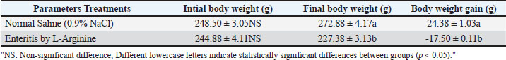 Table 1 shows that the enteritis group exhibited a significant decrease (p ≤ 0.05) in both final body weight and overall body weight gain compared to the controls.
