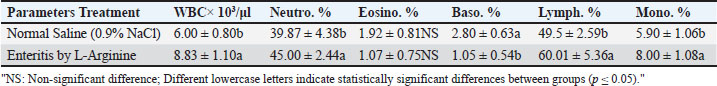 Table 3 indicates a significant increase (p ≤ 0.05) in total white blood cell count, neutrophils, monocytes, and lymphocytes in the enteritis group compared to the control group, whereas basophil percentages significantly decreased (p ≤ 0.05). Eosinophil levels showed no significant change (p > 0.05).