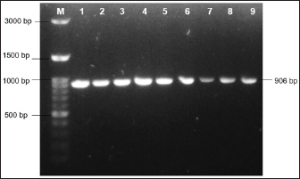 Fig. 2. Amplicons of bubaline Cyt-b along 906 bp at 1% agarose gel. Line 1–9=represented DNA samples; M=DNA ladder 100 bp.