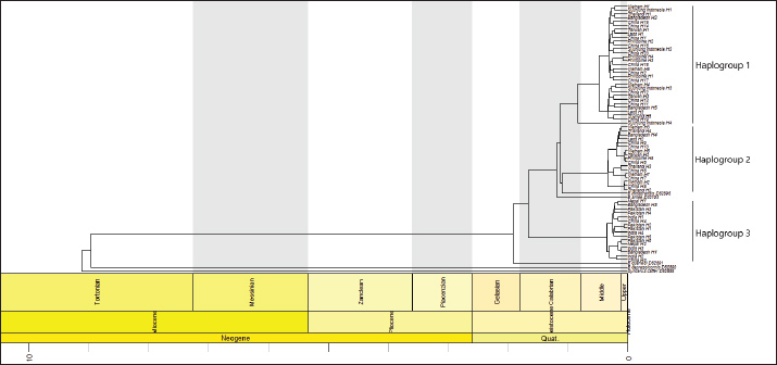 The genetic divergence analysis of Asian swamp buffaloes (Fig. 6) revealed that Haplotype 3 (riverine lineage) was an old cluster that existed during the early Calabrian period (1.8–0.8 mya). Haplotype 2 and Haplotype 1 were established during the last Calabrian period. Therefore, B. bubalis has been separated from Bubalus quarlesi since the last Gelasian period (2.6–1.80 mya). Interestingly, B. bubalis and Bubalus depressicornis have been separated since the middle of Tortonian (Neogene) period (11.6–7.2 mya). It can be predicted that the buffaloes migrated to the Sijunjung from 0.2 to 0.8 mya or during the middle of the Pleistocene period.