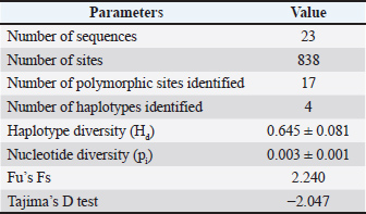 Seventeen polymorphic sites were identified within the partial Cyt-b region of the buffaloes examined, which exhibited four distinct haplotypes of sequence variation (Table 2). A total of 16 polymorphic sites were observed in the H4 animal, as indicated in Table 2. Mostly, mutation sites occurred in the H4 animal (15 sites). Therefore, the haplotype diversity (Hd) and nucleotide diversity (pi) values for the Cyt-b region in the studied animals were recorded as 0.645 ± 0.081 and 0.003 ± 0.001, respectively (Table 3). Furthermore, a positive value for Fu’s Fs statistic and a negative value for Tajima’s D test were found in the Cyt-b region of the buffaloes under investigation.