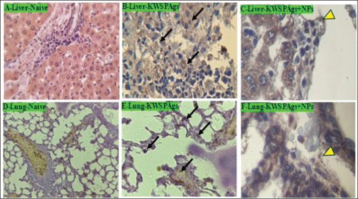 Fig. 4. Immunohistochemical staining of the liver of naive, KWSPAgs, and KWSPAgs+NPs at 14 days post-infection with P. aeruginosa. Naïve immunohistochemistry showed negative staining cells (Fig. 4A), KWSPAgs showed potent positive staining represented by pink-red-brown cells (black arrow) (Fig. 4B), and KWSPAgs+NPs showed scattered pink-red-brown cells (yellow head arrow) (Fig. 4C). Immunohistochemical staining, the lung of Naïve, KWSPAgs, and KWSPAgs+NPs at 14 days post-infection with P. aeruginosa (Fig. 4D–F). DiscussionPseudomonas aeruginosa is a dominant pathogen that contributes to morbidity and mortality (Hudson and Hay, 1980). Pseudomonas aeruginosa is considered one of the major nosocomial infections and is associated with antimicrobial resistance. As the treatment against this bacteria has been costing millions of dollars annually, a deep investigation and understanding of the immune response by the host against infection is needed as a primary way for future therapeutic targets as well as for future vaccine design if possible, which both of these options have been a challenge among increasing the cases of infection annually. The use of nanoparticle delivery systems as carriers for molecules of various sizes to enhance the pharmacokinetic and pharmacodynamic characteristics of different kinds of therapeutic molecules has recently drawn attention to nanoparticle research in the fields of vaccination and medication delivery, so nanoparticles have been utilized to limit the availability of drugs to specific locations, safeguard the drug entity in the systemic circulation, and transport the medication to the site of action at a steady and regulated rate (Jurado-Martín et al., 2021; Al-Juhaishi et al., 2025). On the other hand, designing a vaccine against P. aeruginosa has been a major challenge in reducing infections (Najahi-Missaoui et al., 2020; Sendra et al., 2024) thus, there is a critical need to establish a primary method for that and establish a first step that could be considered as a start-up for a major project of vaccine design. Interleukins are active glycoproteins that are mostly produced by macrophages and activated lymphocytes (Johansen and Gøtzsche, 2015). IL-2 was one of the earliest cytokines to be identified and first promote lymphocyte proliferation. Since then, it has emerged that activated T cells are the main source of this cytokine, which also functions as an autocrine growth factor for T cells and a paracrine growth factor for NK cells. IL-2 plays a vital role in the development of immunity. IL-2 plays a role during the inflammatory response and is considered a potent inducer of T-cell proliferation, including T-helper 1 and T-helper 2 effector T-cell differentiation (Elmslie et al., 1991). These studies agree with the results of our study, where IL2 was significantly increased in KWSPAgs compared with Naïve group suggesting the successful immunogenicity of KWSPAgs. At the same time, the level of IL2 was significantly increased in KWSPAgs +NPs compared with KWSPAgs alone, suggesting the successful delivery of NPs, increasing the immunogenicity and the chances of establishing start-up first-step vaccine design. IgGs are crucial mediators of immunological protection against invading pathogens. They exert their biological effects through several effector systems (Hoyer et al., 2008). The protein IgG is among the most prevalent immunoglobulins and can contribute up to 20% of plasma protein. It is the major class of immunoglobulins (Hoyer et al., 2008; Li et al., 2025). Recent studies have shown such a link between cases of P. aeruginosa and IgG elevation in both experimental and clinical studies (Kapur et al., 2014). These results agreed with the results of our study, which showed that KWSPAs were significantly increased compared with Naïve group suggesting the successful role of KWSPAgs, while NPs improved the delivery of KWSPAgs compared with KWSPAgs alone, suggesting the successful role of NPs reaching out to more space area compared with KWSPAgs alone without NPs. TLRs are considered a crucial activator player in innate immunity by recognizing specific patterns of microbial components. TLR signaling pathways arise from intracytoplasmic TLR domains, which are conserved among all TLRs and have demonstrated their ability to identify particular microbial component patterns that are shared by all infections (Salauddin et al. (2025). The results of our study have revealed that TLRs were significantly increased in KWSPAgs compared with Naïve group while group with NP were successfully approving their successful role in activating the delivery of KWSPAgs to induce TLR2. Cellular immunity is considered an indicator after P. aeruginosa infection (Katoh et al., 2016). Cytokines are considered one of the major immune markers for cellular immunity and an indicator of immune response. Our results have shown that KWSPAGs were significantly increased in T3 (KWSPAgs + NPs) compared with T2 (KWSPAgs alone), whereas IL2 was significantly increased in KWSPAgs compared with Naïve. The results of our study have indicated that P. aeruginosa could induce the immune response compared with Naïve group. The results obtained from the current study were consistent with those of previous studies, where IL2 was successfully induced after experimental inoculation of P. aeruginosa (Takeda and Akira, 2004). Inflammation can be created by several different causes, including immune system activation, and the infiltration of immune cells is well known to be correlated with immune cells (Zuercher et al., 2005; Roe, 2021). The results of our study have indicated a significant infiltration of inflammatory cells as well as in immune histochemistry in the KWSPAgs group compared with Naïve alone, whereas this infiltration has been significantly increased in KWSPAgs+NPs compared with Naive and KWSPAgs alone. These results were consistent with those of previous studies that have shown that 