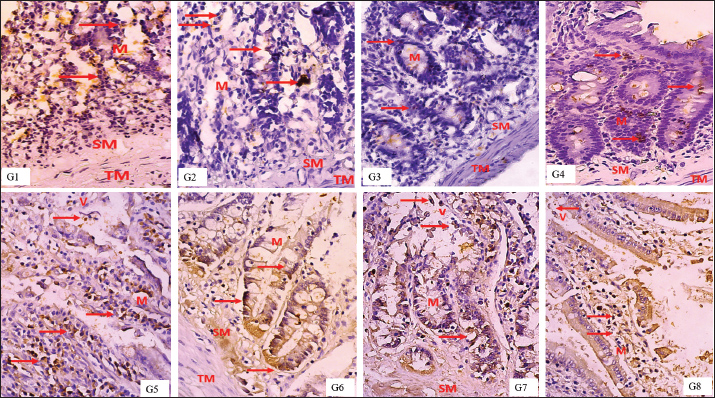 Hematocrit values were relatively stable across all groups, with the lowest observed in the high-dose combination group (45.32% ± 1.01%) and the highest in the low-dose combination group (51.42% ± 1.74%), indicating variability in erythropoietic response. While DRP-fed groups did not show sharp reductions in hematocrit, there was a modest downward trend in groups receiving single extracts compared to normal. Interestingly, serum iron (Fe) concentrations increased substantially in all extract-treated groups. The highest level was observed in the MEB group (328.67 ± 91.33 μg/dl), followed by EEG (277.67 ± 105.64 μg/dl) and EEG 20 mg/kgBW + MEB 6 mg/kgBW (273.00 ± 87.32 μg/dl). These values were markedly higher than the LPD group (182.67 ± 64.06 μg/dl) and normal control (212.50 ± 101.60 μg/dl), suggesting an enhancement in iron absorption or mobilization following extract administration. Total iron-binding capacity was slightly increased in most groups, with the highest value in the LPD + diet normal group (566.67 ± 65.56 μg/dl). A notable decrease was seen in the high-dose combination group (447.50 ± 22.14 μg/dl), possibly reflecting improved iron utilization and reduced iron-deficiency signals. These findings indicate that both EEG and EMB extracts, alone or in combination, positively influence iron metabolism, though dose-dependent effects on hemoglobin restoration may require further elucidation. Effect of extracts on intestinal PEPT1 expressionThe IHC analysis of PepT1 expression in the small intestine revealed distinct staining patterns across the experimental groups. In the normal group (G1), mild PepT1 expression was observed, with weak brown staining in the mucosa (M) and sparse expression in the tunica muscularis (TM) and submucosa (SM). The positive control group (G2) showed similar mild expression, while the negative control group (G3) had minimal to absent PepT1 staining. In the treatment groups, EEG40 (G4) and MEB12 (G5) displayed moderate PepT1 expression, indicated by brown staining in the mucosa and extending to the TM and SM. The most intense PepT1 expression was seen in the high-dose combination group (G6), where dense brown staining localized predominantly in the mucosal villi (V) and mucosa (M), with notable extension into the TM and SM layers. This suggests robust transporter activity in response to the combined extract. The medium-dose (G7, EEG20+MEB6) and low-dose (G8, EEG10+MEB3) combination groups also showed pronounced PepT1 expression, although less intense than in G6. In these groups, staining was consistently observed in the villi and mucosa, indicating enhanced nutrient absorption capacity. Overall, these histological observations confirm that the combined extracts, particularly at high doses, effectively upregulated PepT1 expression in the small intestine. This enhanced transporter activity is consistent with the observed bodyweight recovery in these groups, highlighting the therapeutic potential of these functional food extracts in addressing protein-energy malnutrition. The results in Figure 2 showed varying median scores for different treatment groups. The normal, positive control, and negative control groups had comparable median scores of 2, with narrow minimum-maximum ranges. Among the treatment groups, EMB (10.5; 8–15) and EEG10+MEB3 (9; 9–12) exhibited the highest median values, suggesting notable effects of the MEB and its low-dose combination with EEG. The high-dose combination group had a median score of 7.5 (6–9), while EEG alone was lower at 4 (1–8). The progressive increase in median scores in combination groups suggests a potential synergistic effect between EEG and MEB, particularly at lower or moderate doses, which may reflect enhanced biological activity or improved nutrient uptake. Overall, these findings support the role of these functional foods in modulating key outcomes in malnutrition recovery, balanced synergistic effect without oversaturation or suppression.