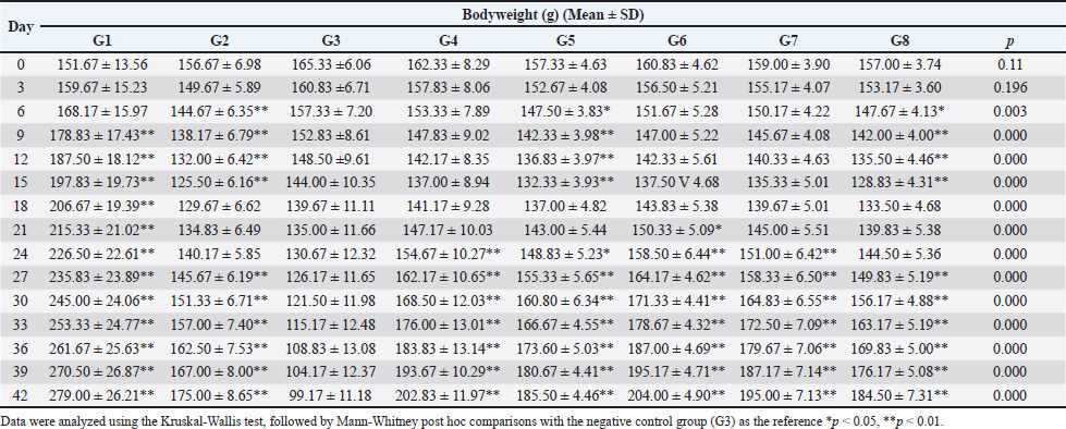 Open Vet. J.. 2025; 15(12): 6423-6433 Open Veterinary Journal, (2025), Vol. 15(12): 6423-6433 Research Article Functional recovery from malnutrition via extracts of Glycine max L. Merr and Brassica oleracea L in rats: Impacts on bodyweight, hematology, and PEPT1 expressionTri Widyawati1*, Dwi R. Anggraini2, Siti Syarifah1, Sri Melinda Kaban1 and Nor Adlin Md. Yusoff31Department of Pharmacology and Therapeutic, Faculty of Medicine, Universitas Sumatera Utara, Medan, Indonesia 2Department of Anatomy, Faculty of Medicine, Universitas Sumatera Utara, Medan, Indonesia 3Department of Toxicology, Advanced Medical and Dental Institute, Universiti Sains Malaysia, Penang, Malaysia *Corresponding Author: Tri Widyawati. Department of Pharmacology and Therapeutic, Faculty of Medicine, Universitas Sumatera Utara, Medan, Indonesia. Email: tri.widyawati [at] usu.ac.id Submitted: 14/07/2025 Revised: 22/10/2025 Accepted: 03/11/2025 Published: 31/12/2025 © 2025 Open Veterinary Journal