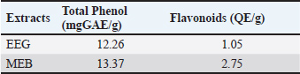 Furthermore, quantitative analysis of the extracts revealed that MEB contained higher total phenolic content (13.37 mg GAE/g extract) compared to the EEG, which contained 12.26 mg GAE/g extract. MEB also exhibited superior total flavonoid content (2.75 mg QE/g extract), significantly higher than that of EEG (1.05 mg QE/g extract). The elevated phenolic and flavonoid contents in MEB suggest enhanced antioxidant potential, aligning with its observed biological activities and supporting its role as a potent functional food component (Table 4). Table 4. Total phenol and flavonoids of extracts.