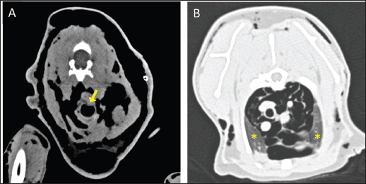 Fig. 2. Transverse CT images acquired with the cat placed in the VetMouse TrapTM. (A) Presence of gas attenuation material in the subcutis around the neck, consistent with subcutaneous emphysema. A dorsal deformation of the cervical trachea with mild reduction of the tracheal diameter is visible in the same scan (A, yellow arrow). (B) The presence of mild pneumo-mediastinum and pneumothorax is further observed, and the collapsed lung lobe is noted (B, yellow asterisk).
