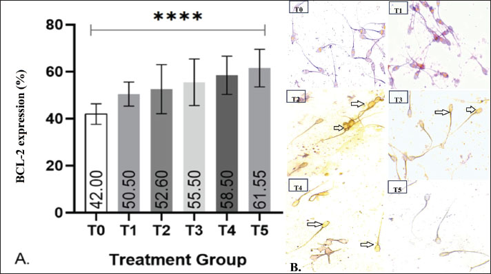 The post-thaw expression of BCL-2 in Kacang goat spermatozoa is shown in Fig. 3. Positive BCL-2 expression was identified by brownish staining localized in the head and midpiece regions of the spermatozoa, reflecting its anti-apoptotic role in enhancing sperm survival after cryopreservation. Representative microscopic images (Fig. 3B) further confirm these findings, showing more intense brown staining in the head and midpiece of spermatozoa in treatment groups compared with the control.