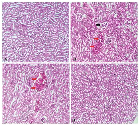 Fig. 5. (A–D): Photomicrograph of kidney tissue sections stained with H&E (×100) showing no histopathological changes in the kidney parenchyma (A) in the control and ND groups. Rats that received a SD showed severe atrophy of the glomerular tuft (black arrows) associated with severe congestion of the interstitial blood vessels (red arrows) (B, C). Kidneys of (SD + CV) treated rats showing mild vacuolar degeneration associated with marked restoration of normal histologic architecture (D). Table 5. Changes in some biochemical parameters in different treatment groups.