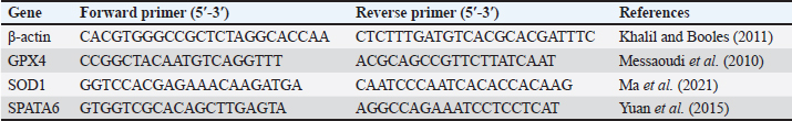 Biological experimentForty-five adult male albino Wistar rats, weighing 200–270 g were obtained from the Animal Care Unit of the National Research Centre (NRC), Egypt. The animals were fed a standard chow diet and water ad libitum. They were housed in transparent plastic cages with wood shavings in a freely ventilated room with controlled room temperature (25°C ± 1°C), humidity (50% ± 10%), and alternating 12 hours cycles of light and dark. The animals were allowed to acclimatize in their new environment for 1 week before the commencement of the experiment. Then, they were randomly divided into three groups (G1, G2, G3) with 15 rats each. G1 received a normal balanced diet (ND), G2 received a salt-deprived diet (SD), and G3 was supplemented with SD plus encapsulated Chlorella 1% of the diet. SamplingAfter eight successive weeks of treatment, the animals were fasted overnight, euthanized under anesthesia with ketamine hydrochloride Intramuscular (45 mg/kg, IM), and sacrificed by cervical dislocation. Blood samples were collected from the medial retro-orbital venous plexus of rats using micro hematocrit capillaries (Abdi-Azar and Maleki, 2014). Heparinized blood samples were collected for biochemical analysis using commercial reagent kits (Roche Diagnostics, Laval, QC, Canada). The testis and epididymis were carefully dissected out. One testis from each rat was preserved at −80°C for later evaluation of quantitative real-time mRNA gene expression in the testes, and the other was preserved in 10% formalin for histopathological examination. Epididymal semen was also collected for microscopic examination of the epididymis semen picture. Blood samples were centrifuged, and the collected plasma was kept in −20 C for analysis of possible changes in organ function-related parameters Aspartate transaminase (AST), Alanine transaminase (ALT), Gamma-glutamyl transferase (GGT), urea, uric acid, and creatinine for kidney), total protein, albumin, and some oxidative and antioxidant biomarkers Malondialdehyde (MDA and catalase), glucose, and triglyceride were performed using commercial kits from Biodiagnostic Egypt. Inflammatory cytokines Tumor Necrosis Factor α (TNFα), InterLeukin-6 (IL-6), and Toll-like receptors (TLR), ghrelin, and testosterone hormone levels were analyzed with ELISA kits (TNF-α, IL-6 kit was purchased from Bio-Source International Inc, 542, Flynn Road, Camarillo, California, USA; ghrelin kit from DRG International, Inc, USA). Evaluation of the epididymal spermatozoaThe caudal part of the epididymis was cut and squeezed to harvest the epididymal sperms and suspended in 1 ml warm phosphate-buffered saline. Sperm motility was estimated immediately on a clean warm slide. The concentration of sperms was determined after diluting the epididymal content with 2.9% sodium citrate dehydrate solution (Türk et al., 2007). Sperm cell count in 1 mm3 of the suspension was detected using a hemocytometer. Then, the total number of sperms/epididymal tail were calculated=sperm number in 1 mm3 of diluted suspension × dilution rate × 1 ml (total volume of the epididymal suspension). Sperm abnormalities were assessed via slide smearing of one drop of epididymal content, followed by staining with eosin nigrosine. A total of 200 sperm were examined by a light microscope for sperm abnormalities such as banana-shaped, straight, and other abnormalities (Okamura et al., 2005). Quantitative real-time polymerase chain reactionRNA was isolated from rat testicular tissues using RNA Easy Mini Kit (Qiagen, Germany) (Cat. No.: 74104). Then, the concentration and purity of the total extracted RNA were determined using a NanoDrop One microvolume UV spectrophotometer (Thermo Fisher Scientific, USA). The RNA of each treatment was converted to first-strand cDNA according to the manufacturer’s instructions using the Revert Aid First Strand cDNA Synthesis Kit (Cat. No.: K1621; Thermo Fisher Scientific, USA). The specific primer sequences are listed in Table 2. The expression levels of Glutathione Peroxidase 4 (GPX4), Super Oxide Dismutase 1 (SOD1), and SPATA6 genes were normalized with respect to β-actin transcript using Maxima SYBR Green qPCR Master Mix (2X) (Cat. NO.: K0221; ThermoFisher Scientific, USA) and calculated by 2−ΔΔCT method (Livak and Schmittgen, 2001). The reaction conditions were as follows: 95°C for 10 minutes, 95°C for 15 seconds, 55°C for 30 seconds, and 72°C for 30 seconds, with a total of 40 cycles of amplification. The DNA Technology Detecting Thermocycler DT Lite 4S1 (Russia) was used for gene expression quantitation. Table 2. Primers used for qRT–PCR.