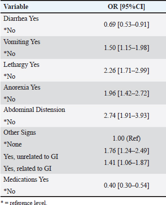 Factors associated with ER referralUnivariable analyses, based on the chi-square test, revealed that the following eight variables were associated with ER referral rate: age group (p < 0.011), diarrhea (p < 0.001), vomiting (p < 0.002), lethargy (p < 0.0001), anorexia (p < 0.0001), abdominal distention (p < 0.0001), the presence of other clinical signs (p < 0.0001), and medications (p < 0.0001). With the exception of age, diarrhea, and medications, the presence of a factor was associated with an increased risk of emergency facility referral. However, the presence of diarrhea or medications was associated with a decreased risk of emergency facility referral. When these eight variables were entered in a multivariable logistic regression model, subject to backward variable selection, seven of these variables (age group was eliminated) were independently and significantly associated with ER referral (Table 2): diarrhea (OR=0.69 [0.53–0.91], vomiting (OR=1.50, 95%CI=[1.15–1.98]), lethargy (OR=2.26 (1.71–2.99), anorexia (OR=1.96 [1,42–2.72]), abdominal distention (OR=2.74 [1.91–3.93]), the presence of other clinical signs (OR=1.76 [1.24–2.49] for signs unrelated to GI and OR=1.41 [1.06–1.87] for signs related to GI), and medications (OR=0.40 [0.30–0.54]) when compared to the reference category of “No” or “None.” Table 2. Results of multivariate logistic regression (OR and 95% CI) after selection of backward variables.