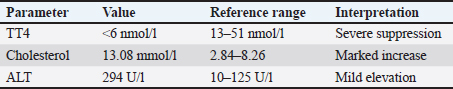 ABSTRACTBackground: Hypothyroidism is a common endocrine disorder in dogs; however, drug-induced hypothyroidism is uncommon in humans and veterinary medicine. Sulfonamides are among the few antibiotics known to interfere with thyroid function. However, reports in dogs are rare and often underrecognized. Case Description: A 12-year-old male Bichon Frise presented with alopecia and a history of slowness and weakness, weight gain despite unchanged food intake, and poor coat quality. A palpable bilateral symmetrical mass was observed in the neck area on examination. The patient had been receiving trimethoprim–sulfamethoxazole therapy for several months. Laboratory testing revealed reduced total thyroxine (TT4), consistent with iatrogenic hypothyroidism secondary to prolonged sulfonamide administration. Following drug discontinuation, TT4 values normalized within 7 days, and the dog showed marked clinical improvement, which confirmed the suspected diagnosis. Conclusion: This case highlights the potential of prolonged sulfonamide therapy to induce reversible hypothyroidism in dogs. Clinicians should be aware of this adverse effect because early recognition and drug withdrawal can lead to rapid clinical and biochemical recovery. Keywords: Dog, Hypothyroidism, Trimethoprim–sulfamethoxazole. IntroductionHypothyroidism is a common endocrine disorder in dogs that occurs when the thyroid gland produces lower amounts of tri-iodothyronine (T3) and thyroxine (T4) hormones (Dixon et al., 1999; Mooney, 2017). The most common form of primary hypothyroidism is idiopathic atrophy of the thyroid gland or lymphocytic thyroiditis (Nelson, 2014), which usually occurs in medium- to large-sized, middle-aged dogs (Dixon et al., 1999). The common clinical signs of this condition include: weight gain despite a controlled diet, lethargy, and skin and coat problems. Less commonly, clinical signs of hypothyroidism involve neurologic, cardiovascular, ophthalmic, and reproductive abnormalities (Dixon et al., 1999; Scott-Moncrieff, 2007; Mooney, 2017). The diagnosis is based on a combination of clinical signs, blood analysis (complete blood count, serum biochemistry panel) in conjunction with a decreased serum T4 and free T4 (fT4), and an increased serum thyroid-stimulating hormone (TSH) concentration (Scott-Moncrieff et al., 2015). Although hypothyroidism is one of the most common endocrine disorders in dogs, it is also often over-diagnosed (Oberbauer et al., 2025). The overdiagnosis of hypothyroidism represents a significantly greater concern than its underdiagnosis (Dixon et al., 1999). Many nonthyroidal factors, including breed, age, gender, concurrent illness, and certain drugs, can significantly affect the results of hormone measurements (Travail et al., 2024). Some medications, such as sulfonamides, can cause clinical hypothyroidism, and microscopic or even macroscopic goiter can occur (Bolton and Panciera, 2023). This case report describes a dog with sulfonamide-induced goitrous hypothyroidism. Case DetailsA 12-year-old male Bichon Frise was examined in a private veterinary clinic 6 months ago due to suspicion of urinary infection. The dog urinated frequently, sometimes uncontrollably, and blood traces were observed several times. Microscopic examination of the urine confirmed a higher number of bacteria. An antibiogram for amoxicillin and clavulanic acid was performed, and after it showed sensitivity to the aforementioned antibiotic, therapy was initiated [Amoxicillin/Clavulanic acid (12.5 mg/kg, PO, q 12 hours)]. The antibiotic was changed due to poor tolerance. Trimethoprim-sulfamethoxazole was initiated without performing a urine culture [sulfamethoxazole/trimethoprim (30 mg/kg, PO, q 12 hours)]. Treatment has been continued for the next few months due to the lack of improvement in the patient’s condition. Apart from the abovementioned symptoms, the dog showed additional signs of illness in the form of slowness and weakness, its coat became thinner, and weight gain was also observed despite consuming the same amount of food for the next few months. At reevaluation, the dog was alert and responsive but showed signs of lethargy and thinner fur. Due to the suspicion of Cushing’s disease, an adrenocorticotropic hormone stimulation test was performed. The test was negative. Abdominal ultrasound examination revealed small uroliths and a cyst on the left kidney and several cystoliths. The right adrenal gland was enlarged, which is why pheochromocytoma was suspected, and the planned surgical procedure to remove uroliths was postponed. The dog was referred to the Clinic for Internal Diseases, Oncology, and Emergency Medicine of the University of Sarajevo – Veterinary Faculty for further investigation 6 months after the first examination due to the lack of visible improvement. At clinical examination, the patient was found to be responsive. According to the WSAVA recommendations (2013), the body condition score was 6/9. The body temperature, heart rate, and respiratory rate were within the reference ranges. The fur was diffusely thinned, and a bilateral symmetrical subcutaneous mass was palpated in the region of the larynx. The remaining physical examination was unremarkable. The history and clinical examination were followed by blood sampling from the cephalic vein into an IDEXX EDTA KE/1.3 microtube for complete blood count and an L-heparin LH/1.3 microtube for heparinized plasma biochemistry panel (Chem 17 CLIP), and electrolytes (Lyte 4 CLIP). A ProCyte® Hematology Analyzer (Idexx Laboratories Inc.) was used to perform a complete blood count, and a Catalyst One® Chemistry Analyzer (Idexx Laboratories Inc.) was used to analyze the biochemistry panel and electrolytes. The complete blood count showed microcytosis, low mean corpuscular hemoglobin and reticulocyte hemoglobin concentration, and mildly elevated plateletcrit values. The biochemistry profile revealed mildly elevated alanine transaminase and gamma