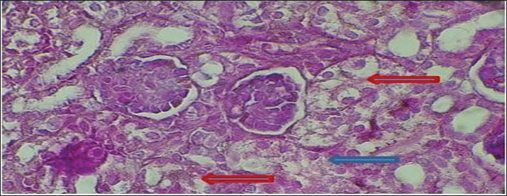 Fig. 3. Cross-histological section of cortex of 1-week-old hamsters showing the proximal and distal tubules with simple cuboidal epithelium (red arrow) and glomerulus arterioles (blue arrow). 40x. Alcian blue staining.