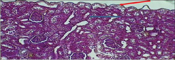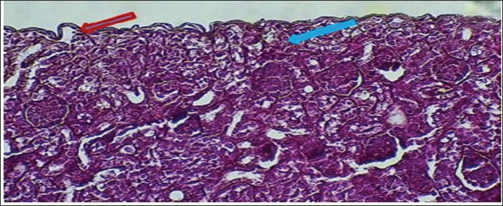 Fig. 7. Cross-section of kidney cortex at 2 weeks of age showing two layers of connective tissue capsule (red arrow) and sub capsular simple columnar epithelium (blue arrow). 20x. Masson’s trichrome stain.