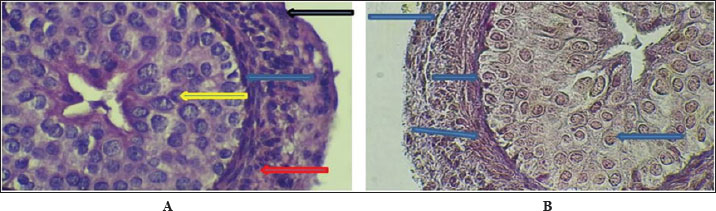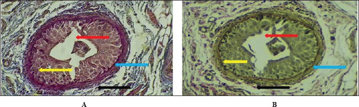 Fig. 10. Cross-histological section of the ureter in hamsters aged 3 weeks showing a hollow lumen (red arrow) in the middle, a simple squamous epithelial layer (yellow arrow), smooth muscle (blue arrow), and serosa (black arrow) A-20x Masson trichrome stain, B- 20x. van -gison stain.