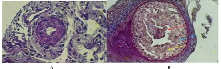 Fig. 8. Cross-histological section of the ureter in hamsters aged 2 weeks showing a mild lumen (red arrow) in the middle, simple squamous epithelial (yellow arrow), smooth muscle A-10x H&E stain B- 20x. alcian blue.