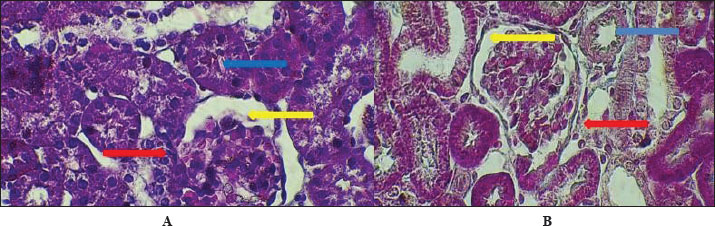 Fig. 9. Cross-histological section of the renal cortex in hamsters aged 3 weeks. Renal corpuscle (yellow arrow), junction of glomeruli capsule with proximal tubule (red arrow), and renal vein (blue arrow). A- 40x H&E stain, B- 40x. Masson’s trichrome stain.