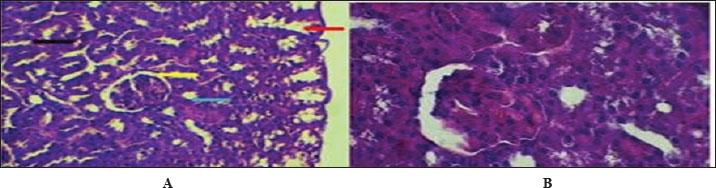 Fig. 11. Cross-histological section of the renal cortex in hamsters aged 2 months, consisting of the capsule (red arrow), distinct renal corpuscles (yellow arrow), and proximal tubule (blue arrow) and distal tubule (black arrow). A- 20x. PAS stain. B- 40x. H&E.