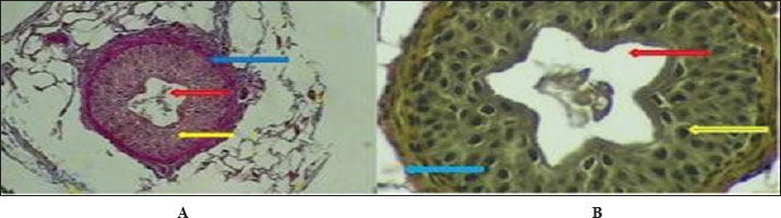 Fig. 4. Cross-histochemical section of the ureter in hamsters aged 1 week showing a narrow lumen (red arrow) in the middle, simple squamous epithelial (yellow arrow), and thin smooth muscle (blue arrow). A- 10x. H&E stain. B- 20x Alcian. blue.