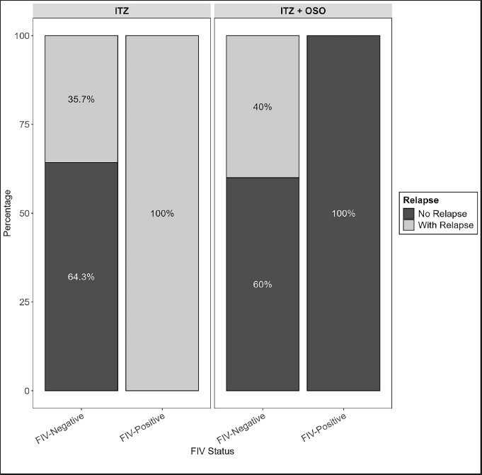 Despite the lack of statistical significance (p=0.135), a clinically meaningful difference emerged: 47.06% of animals in the ITZ group experienced relapse, compared to only 19.05% in the ITZ + OSO group. Notably, among animals with relapse, the time to lesion reappearance was longer in the ITZ + OSO group than in the ITZ + OSO group (p=0.142). Lesions located exclusively on the head were associated with a lower relapse rate, whereas wounds involving multiple regions, such as the limbs, trunk, or their combinations, were associated with a higher likelihood of relapse. Although healing time did not differ between the groups (p=0.986), the ITZ + OSO group exhibited clinically relevant trends, including a lower relapse rate and a longer time to relapse. Figure 1 explores the interaction between the FIV status and relapse. All FIV-positive animals in the ITZ group experienced relapse, whereas no relapse was observed among FIV-positive animals in the ITZ + OSO group (p=0.0027). Relapse rates were comparable between groups among FIV-negative individuals, reinforcing that the ITZ + OSO protocol may be more effective in immunocompromised patients.