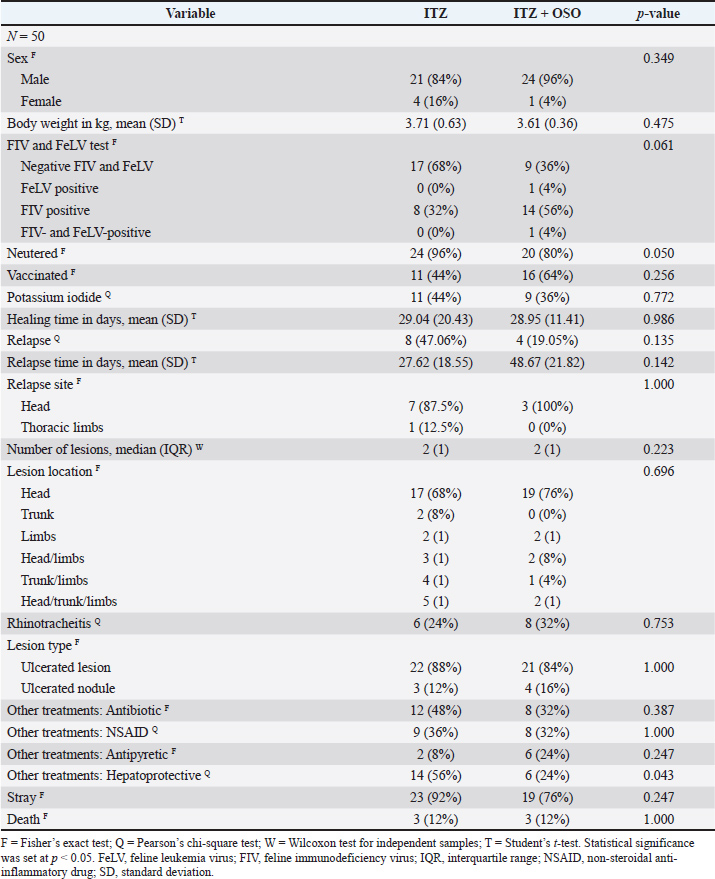 AbstractBackground: Feline sporotrichosis, primarily caused by Sporothrix brasiliensis, is a zoonotic fungal infection with limited therapeutic options. Aim: This study evaluated the efficacy of ozonized sunflower oil (OSO) as an adjunct to itraconazole (ITZ) in 50 cats with sporotrichosis. Methods: Animals were randomized into two groups: ITZ alone (100 mg/cat once daily, n=25) and ITZ plus topical OSO (700 meq/kg peroxide index, once daily, n=25). Primary outcomes (wound healing time) and secondary outcomes (relapse rate) were assessed over 120 days. Results: Although the healing times were similar (ITZ: 29.04 ± 20.43 days; ITZ + OSO: 28.95 ± 11.41 days; p=0.986), the ITZ + OSO group showed lower relapse rates (19.05% vs. 47.06%, p=0.135) and delayed recurrence (48.67 vs. 27.62 days, p=0.142). Notably, no relapses occurred in cats positive for feline immunodeficiency virus treated with ITZ + OSO (p=0.0027). Conclusion: The immunomodulatory and antifungal properties of OSO may enhance therapeutic outcomes, particularly in immunocompromised animals. Keywords: Sporotrichosis, Itraconazole, Ozonized sunflower oil, Integrative therapy, Feline. IntroductionSporotrichosis is a globally distributed zoonosis, predominantly found in tropical and subtropical regions due to favorable climatic conditions for its etiological agent (Rabello et al., 2022). The disease is caused by dimorphic fungi of the Sporothrix complex, with at least six pathogenic species, particularly Sporothrix schenckii and Sporothrix brasiliensis, the latter of which was identified in Brazil in 2007 and is now recognized as the most prevalent species in the country (Gremião et al., 2017; Da Rocha et al., 2018). Cats (Felis catus) serve as the primary transmission vectors, with infection typically occurring through traumatic inoculation via scratches or bites from infected animals (Gremião et al., 2017; Gremião et al., 2021). Fungal transmission may also result from contact with contaminated plants, soil, or decomposing organic matter, or less commonly through conidia inhalation (López Romero et al., 2011; Gremião et al., 2021). Self-inoculation through scratching or licking contributes to disease spread, with higher prevalence observed in intact male domestic shorthair cats due to their territorial behaviors (Pereira et al., 2014). These feline reservoirs significantly amplify environmental contamination, facilitating zoonotic transmission (Montenegro et al., 2014). Itraconazole (ITZ) remains the first-line treatment, although its utility is limited by hepatotoxicity, prolonged administration, and refractory cases (Da Rocha et al., 2018). Treatment success depends on multiple factors, including drug selection, dosing regimen, compliance, and fungal susceptibility (Nakasu et al., 2021). These limitations underscore the need to explore alternative therapies, particularly for patients exhibiting resistance to ITZ (Poester et al., 2019). Ozone (O3) therapy has emerged as a promising adjunctive approach for treating cancer. Ozone is an allotropic form of oxygen that acts as a potent oxidizing agent that disrupts microbial cell membranes by oxidizing amino acids and proteins. Against fungi, O3 specifically targets disulfide bonds in cell walls, penetrates the cytoplasm, and inhibits vital cellular functions while stimulating cellular and humoral immune responses (Ouf et al., 2016). Plant-derived ozonized oils represent a pharmaceutical approach to treating human and animal pathologies. Among these, ozonized sunflower oil (OSO) has demonstrated significant antifungal activity against Candida, Aspergillus, dermatophytes (Guimarães et al., 2020), and Sporothrix spp. (González, 2016). Therefore, this study evaluated the efficacy of OSO as a complementary therapy to ITZ for feline sporotrichosis. Materials and MethodsStudy location and experimental designInstitutionalized stray felines were selected from the Animal Welfare Center (CBEA) located in the city of Canoas, Rio Grande do Sul, Brazil. The CBEA is a municipal public institution responsible for sheltering, housing, sterilizing, and eventually adopting street animals and those subjected to domestic abuse. The research was conducted between August 2024 and April 2025 through an open clinical trial involving 50 animals randomly allocated in a 1:1 ratio into two groups of 25 animals each, with no preference for age, weight, or sex. The following inclusion (a) and exclusion (b) criteria were applied: a) wounds and or ulcerated nodules contaminated with Sporothrix spp., varying in size and anatomical distribution; b) animals with a low body condition score, feral behavior, and negative fungal culture and isolation. DiagnosisThe diagnosis was confirmed by collecting lesion samples with a sterile swab in a specific transport medium, followed by fungal isolation onto chloramphenicol-supplemented Sabouraud Dextrose Agar plates. Plates were incubated at 25°C–29°C for 15 days. A colony fragment was transferred onto yeast extract peptone dextrose agar plates and incubated at 37°C for 7 days to induce the dimorphic transition from mycelial to yeast form, confirming the characteristic fungal dimorphism. Fungal structures were microscopically identified based on morphological characteristics. Therapeutic protocolThe ITZ group received compounded ITZ, provided by the institution, orally, at a dose of 100 mg cat once daily (Gremião et al., 2021). The ITZ oil group received conventional ITZ therapy combined with topical OSO, once daily, with a peroxide index of 700 meq kg, commercially obtained from Ozone Health São Paulo, Brazil. Before oil application, the wounds were cleaned with 0.9% saline solution. The veterinarian in charge of the CBEA sporotrichosis isolation unit performed all therapeutic procedures daily in the morning, following personal protective equipment (PPE) protocols (gloves, gowns, goggles, and masks). Weekly lesion monitoring was conducted through visual assessmen