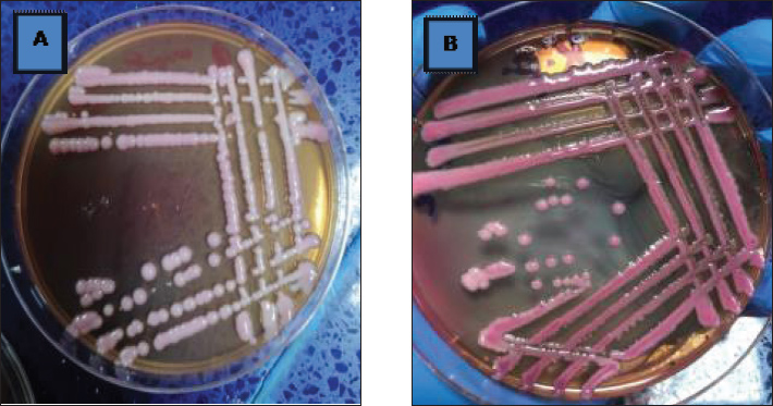Fig. 2. A Comparison between Colonies of klebsiella pneumonia (A) culturing on MacConkey agar which appear as mucoid dark pink colony and Colonies of Raoultella planticola (B ) culturing on MacConkey agar appear as mucoid pink colonies Table 1. VITEK2 result show presence of Raoultella planticola.