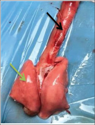 Fig. 3. Ventral view of lung for control group show (black arrow) trachea (green arrow) right lung.