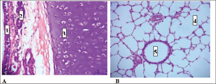 Fig. 5. Control group (A) trachea (1)mucosal layer has ciliated pseudostratified epithelia (2)tracheal gland (3) Hyaline cartilage and (B) lung show (4)Alveolar sac (5) terminal bronchioles and had no pathological change of organ H&E stain 400X 200X respectively
