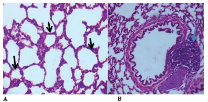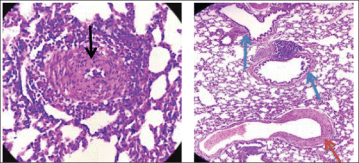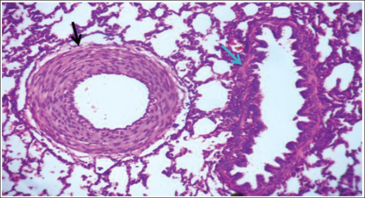 Fig. 7. The lung is show emphysema group of infected rabbits show moderate fibroplasia of arterioles. (black arrow) and tertiary bronchioles (blue arrow). H&E stain 400X (Castro et al., 2001).