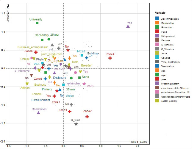 Fig. 3. Graphical representation of the correlations between the variables and MCA dimensions 1 and 2. Table 3. Main diseases and management methods.