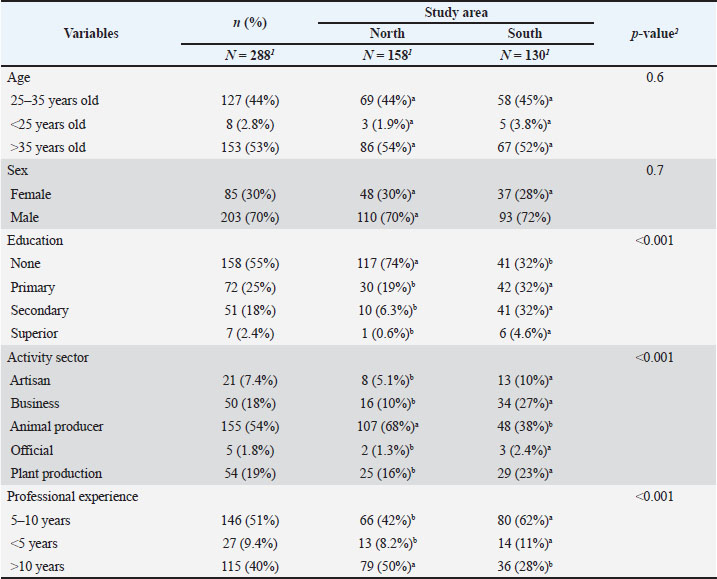 Fig. 1. Mapping of the study area. n=Z2 *P*(1−p)/e2. With an expected proportion (p) of farmers engaged in dairy production set at 50%, a margin of error (e) set at 5%, and a confidence interval (Z) of 90%. The minimum sample size was estimated at n=271 farmers. However, 288 people were surveyed. The data collection tool used was a specially designed semi-structured questionnaire divided into three sections: (1) socio-demographic characteristics of farmers, (2) animal management practices, and (3) production objectives. The form was then digitized on KoboToolbox and administered to the farmers via smartphones by interviewers trained in the use of the questionnaire beforehand. The farms were located based on consultation with veterinary service officers in each commune, while enrollment for the study was based on random sampling, and each respondent was interviewed based on informed consent. Data analysisThe collected data were exported to a Microsoft Excel workbook and recorded before statistical analysis using R Software 4.0.5. First, a descriptive analysis was conducted to calculate the proportions of the modalities of the different variables of interest. Next, 17 qualitative variables describing the sociodemographic characteristics and breeding practices of the farmers were identified and then subjected to a multiple correspondence analysis (MCA) followed by an ascending hierarchical classification (ACH) using the FactoMineR package. Finally, we used parametric and non-parametric tests, such as the chi-square test, Wilcoxon test, Fisher’s exact test, or Kruskal–Wallis test, as appropriate to assess differences between the categorical variables of interest. For all comparisons, the p-values were set at a threshold of p < 0.05 ResultsDescription of the farming practicesSociodemographic characteristics of the respondentsThe sociodemographic characteristics of the farmers are summarized in Table 1. A total of 288 small ruminant keepers from the southern (45.13%) and northern (54.8%) regions were included in this study. Approximately 70% of those interviewed were men, compared with 30% of women. More than half of them (55%) had not received any school education, and farmers in the southern region (68%) were much better educated than those in the northern region (26%). Furthermore, 54% of respondents had livestock production as their main activity, while most farmers (91%) were fairly experienced and had raised small ruminants for at least 5 years. Table 1. Sociodemographic characteristics of the surveyed farmers.