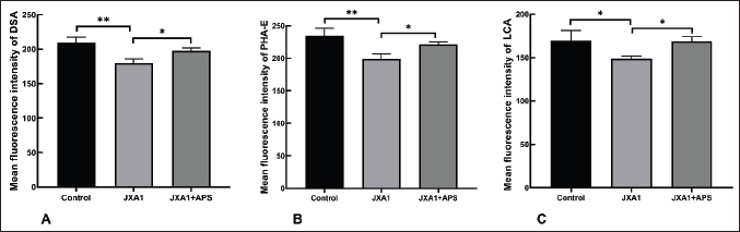 Fig. 2. Effects of astragalus polysaccharide on glycocalyx sugar chain components in porcine pulmonary microvascular endothelial cells. (A) Quantitative analysis of DSA-reactive glycan ligand levels. (B) Quantitative analysis of PHA-E-reactive glycan ligand levels. (C) Quantitative analysis of LCA-reactive glycan ligand levels. “*” indicates P < 0.05, “**” indicates P < 0.01. HP-PRRSV replication in porcine pulmonary MVECsGiven the crucial role of glycocalyx in virus-cell interactions, its status would affect viral infection and replication in host cells. By western blot assay (Fig. 3), there was a notable PRRSV N protein expression in MVECs after exposure to HP-PRRSV JXA1 for 30 hours, and pre-treatment with HPA III increased that. Intervention with 100 μg/ml APS significantly reduced PRRSV N protein expression, whereas the HPA III+APS group showed significantly higher expression than the JXA1+APS group. These results indicate that APS can reduce HP-PRRSV replication in infected MVECs, whereas glycocalyx degradation significantly inhibits its intervention effect. HP-PRRSV-induced TEERThe decreased expression of glycocalyx components indicates the possible disruption of the microvascular endothelial barrier. TEER across the monolayer of porcine pulmonary MVECs was measured In vitro using the Transwell model. The results showed that HP-PRRSV infection significantly reduced TEER, with a gradual decrease observed with increased infection time (P < 0.01), which was significantly upregulated by APS treatment (P < 0.01). Partial degradation of the glycocalyx with HPA III further promoted the HP-PRRSV-induced decrease in TEER (P < 0.01), and it significantly weakened the effect of APS treatment (P < 0.05) (Fig. 4).