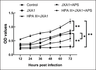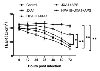 Fig. 4. Effects of astragalus polysaccharide on TEER across the monolayer of porcine pulmonary microvascular endothelial cells infected with the HP-PRRSV JXA1 strain. “*” indicates P < 0.05, “**” indicates P < 0.01. HP-PRRSV-induced HRP-SA leakageTo confirm the regulatory role of APS in barrier function damage caused by HP-PRRSV infection in porcine lung MVECs, we assessed solute permeability. HP-PRRSV infection significantly increased HRP-SA leakage, with an increasing amount of leakage observed with prolonged infection time (P < 0.01), which was significantly attenuated by the APS treatment (P < 0.05) (Fig. 5). After pretreatment with HPA III, the HP-PRRSV-induced HRP-SA leakage was further aggravated, and the APS inhibitory effect was also significantly weakened (P < 0.01).