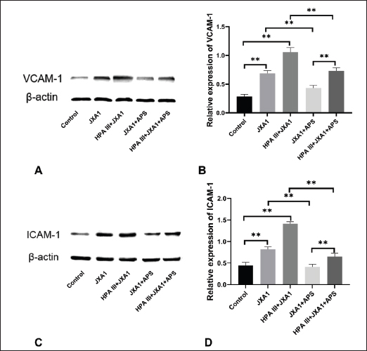 Fig. 6. Effects of astragalus polysaccharide on VCAM-1 and ICAM-1 expression in HP-PRRSV-infected porcine pulmonary microvascular endothelial cells. (A) VCAM-1 levels were quantified by western blot. (B) Statistical analysis of VCAM-1 levels. (C) ICAM-1 levels were quantified by Western blot. (D) Statistical analysis of ICAM-1 levels. “**” indicates P < 0.01. Neutrophil migration across the MVEC monolayer during HP-PRRSV infectionWe examined the transendothelial migration rate of neutrophils and the bactericidal activity of migrated neutrophils to further understand the recruitment and activation of inflammatory cells due to glycocalyx damage. We found that HP-PRRSV infection promoted neutrophil migration across the MVEC monolayer (P < 0.01), which was significantly inhibited by the APS intervention (P < 0.01), and that the partial degradation of the glycocalyx by HPA III not only further increased the HP-PRRSV-induced increase in neutrophil migration rate but also significantly weakened the inhibitory effect of APS on HP-PRRSV-induced neutrophil migration (Fig. 7A). After treating E. coli with neutrophils that had migrated through the MVECs monolayer, the number of bacterial colonies in each group was similar to the migration rate results (fig. 7b), indicating that the bactericidal activity of neutrophils in each group is inversely correlated with their migration rates. In other words, the glycocalyx disruption reduced the bactericidal activity of neutrophils that migrated across the endothelial monolayer, while APS could restore the bactericidal activity of neutrophils by improving the endothelial glycocalyx.