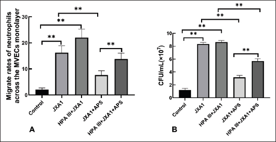 Fig. 7. Effects of astragalus polysaccharide on neutrophil migration across the monolayer of porcine pulmonary microvascular endothelial cells and neutrophil bactericidal activities during HP-PRRSV infection. (A) Neutrophil migration rate across the monolayer of porcine pulmonary MVECs. (B) Bacterial colonies grown after treatment with the migrated neutrophil across the monolayer of porcine pulmonary MVECs. HP-PRRSV infection, HP-PRRSV infection. “**” indicates P < 0.01. DiscussionMVECs not only serve as a barrier between the blood and tissues but also produce inflammatory factors and antiviral proteins that play essential roles in immune and inflammatory responses, with the glycocalyx being a key player. Thus, glycocalyx is a potential therapeutic target for mitigating antiviral damage (Zha et al., 2022). In this study, we used an in vitro model of HP-PRRSV-infected porcine pulmonary MVECs and discovered that APS has a significant regulatory effect on the barrier function of MVECs, the expression of adhesion molecules, and the mediation of neutrophil trans-endothelial migration and bactericidal functions disrupted by HP-PRRSV infection. Furthermore, APS inhibited the replication of HP-PRRSV within porcine pulmonary MVECs; however, glycocalyx degradation significantly weakened the effects of APS. As a natural biological barrier, the glycocalyx’s selective permeability is crucial for maintaining homeostasis between microvessels and tissues. Glycocalyx damage caused by viral infection increases microvascular permeability, leading to the leakage of solutes, plasma proteins, and fluids, which in turn causes inflammation and edema (Wang et al., 2024; Zhan et al., 2025). Proteoglycans and their attached glycosaminoglycan chains are major components of the glycocalyx, and changes in their composition can affect the glycocalyx’s barrier function. For example, the plasma levels of SDC-1, hyaluronan, and heparan sulfate were significantly higher in patients with severe H1N1 influenza, which has been demonstrated in infections of several respiratory viruses, such as the influenza virus (Huang et al., 2022). In this study, HSPG-2, GPC-1, and SDC-1 were selected as representative markers of the basement membrane, GPI-anchored, and transmembrane proteoglycan families, respectively, and constitute the most recognized endothelial glycocalyx research indicators. The determination of the three glycan ligands was based on previous results from the lectin chip (Song et al., 2022). Our results showed significant changes in the expression of proteoglycans HSPG-2, GPC-1, SDC-1, and the LCA, DSA, and PHA-E-reactive glycan ligands, indicating that HP-PRRSV disrupts the glycocalyx components of porcine pulmonary MVECs. SDC-1 shedding from the surface of pulmonary MVECs may be the reason for its elevated plasma level. The impact of PRRSV infection on cell surface monosaccharides has been reported for the first time. TEER measurements and HRP-SA permeability assays further indicated that the barrier function of porcine pulmonary MVECs was compromised. APS treatment significantly reduced the changes in glycocalyx components caused by HP-PRRSV and markedly restored MVEC monolayer barrier function. Glycoproteins are another important glycocalyx component. Carbohydrate chains play a crucial role in their function, although they primarily exhibit the characteristics of proteins due to their generally lower carbohydrate content compared to proteoglycans (Sprovieri and Martino, 2018). The adhesion molecules VCAM-1 and ICAM-1 are glycoprotein components of the endothelial glycocalyx that regulate leukocyte adhesion and trans-endothelial migration through MVECs and play essential roles in inflammatory responses (Singh et al., 2023). Considering that interstitial pneumonia is the primary pathological change in piglets infected with HP-PRRSV, we investigated VCAM-1 and ICAM-1 expression in porcine pulmonary MVECs during HP-PRRSV infection. Our results showed that glycocalyx degradation promoted the upregulation of VCAM-1 and ICAM-1 induced by HP-PRRSV and facilitated neutrophil trans-endothelial migration, while also inhibiting the regulatory effects of APS on these processes. PRRSV infection in piglets leads to neutrophil infiltration in the lungs (Yuan et al., 2022a,b), and the increased trans-endothelial migration of neutrophils by glycocalyx disruption in our research supports this finding. However, the bactericidal ability of neutrophils undergoing trans-endothelial migration was significantly reduced. This indicates that the integrity of the glycocalyx influences not only neutrophil recruitment but also their bactericidal function, potentially contributing to adverse outcomes. Previous studies have shown that piglets infected with HP-PRRSV frequently suffer from secondary bacterial infections (Xiangjinyan et al., 2020). If the increased number of neutrophils entering the lung tissue is unable to effectively eliminate the bacteria responsible for secondary infections, but instead releases a large number of inflammatory factors, a severe inflammatory response will occur. Our findings may partially explain the causes of severe lung injury resulting from secondary bacterial infection. Therefore, protecting the integrity and function of the endothelial glycocalyx is crucial not only for preventing pathological damage caused by HP-PRRSV but also for controlling secondary bacterial infections-induced severe lung damage. The critical role of the pulmonary MVEC glycocalyx in the pathogenesis of several respiratory viruses has been well documented. The shedding of the hyaluronan component of the endothelial glycocalyx significantly increases in the acute respiratory distress syndrome after flu syndrome and is considered to be positively correlated with the 28-day mortality rate and elevated neutrophils in the alveolar septum (Benatti et al., 2020). In SARS-CoV-2 infection, the intact endothelial glycocalyx prevents viruse