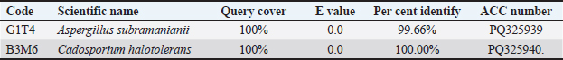 Fig. 5. Phylogenetic tree of potential isolates G1T4 and B3M6. DiscussionMacroscopic characterization and microscopic identificationSampling from Lombok Waters, West Nusa Tenggara, yielded four distinct mollusc species. One of the identified samples belonged to the gastropod class (Cypraea moneta), while the remaining samples were from the bivalvia class, including Spondylus sp., S. squamosus, and A. vexillum. Gastropod and bivalve mollusc exhibit unique morphological traits, underscoring the ecological diversity and the region’s marine habitats. Molluscs are known for their adaptability across a wide range of aquatic environments, which contributes to their ecological success. The fungal isolates (G1T4, B2L4, B3M6, and B4T6) were purified and characterized to distinguish their origin from the specific mollusc host (Table 1). The characterization revealed in colony color, edge morphology, and elevation. Fungal isolates associated with seagrass ecosystems predominantly exhibited green to greyish colony colors. The distinctive feature reflects the biodiversity of fungi associated with different marine habitats. Aligns with findings by Baron and Rigobelo (2022), who reported that fungi adapted to specific environments often display unique colony colors and morphologies, indicating habitat-driven diversity. According to Naranjo-Ortiz and Gabaldón (2019), such variations arise from physiological adaptations to environmental conditions. However, it is important to note that the colony size and colour may change over time as the fungal culture age (Sy. Pakaya et al., 2023). Microscopic identification of fungal isolates associated with molluscMicroscopic identification was conducted to examine the morphological characteristics of four potential fungal isolates using a binocular microscope at 100x magnification (Fig. 1). The objective of these observations was to assess the structure of hyphae, the presence of septa, and the shape of spores (Demeni et al., 2021). Microscopic examination of fungal cultures prepared on glass slides revealed that the following isolates G1T4 and B2L4 exhibited septate hyphae and well-defined conidiophores. Isolate B3M6 also displayed conidiophores, but its hyphae were non-septate. Isolate B4T6 showed the presence of conidiophores; however, hyphae and septa were not clearly visible under the microscope. Conidiophores, also known as conidial stalks, are specialized structures where conidia (asexual spores) are produced. Hyphae are the fundamental filamentous structures of fungi and can vary in size and appearance depending on the species and environmental conditions (Arifah et al., 2023). Phytochemical screening and TLC analysis of mollusc-associated fungal extractsMass cultures of potential mollusc-associated fungal isolates were extracted using ethyl acetate as the solvent. Ethyl acetate was selected due to because of its semi-polar nature, which enables efficient extraction of metabolites and bioactive compounds from the fungal biomass. It is a volatile, non-hygroscopic solvent with low toxicity (Minarni et al., 2017). The resulting crude extracts underwent phytochemical screening to identify the presence of secondary metabolites. The flavonoid test, conducted using 37% hydrochloric acid and magnesium powder, confirms the presence of flavonoids in G1T4 and B3M6. Alkaloid screening using Mayer’s, Wagner’s, and Dragendorff’s reagents indicated that all four fungal extracts (G1T4, B3M6, B4T6, and B2L4) tested positive for alkaloids. The saponin test revealed a result only for G1T4, while the other isolates showed no saponin content. Tests for steroids and tannins, using the Liebermann–Burchard reagent and 5% FeCl3, respectively, did not detect these compounds in any of the fungal extracts. The production of bioactive compounds by these fungi is believed to be influenced by their interaction with mollusc hosts. Studies by Photolo et al. (2020) and Singh and Kumar (2023) suggest that bioactive compounds may be transferred from the host to the associated fungi, enabling the fungi to synthesize secondary metabolites as a defence against pathogenic microbes. TLC was performed to further analyze the extracts. Each sample was applied to a silica gel plate (stationary phase), and a mixture of ethyl acetate: chloroform (7:3) served as the mobile phase (Fig. 2). Visual inspection revealed faint stains on plates, which became clearly visible under UV light at wavelengths of 366 nm and 254 nm. The UV observation showed that the stains had Rf values of 0.88 and 0.61 for the G1T4 extract, 0.96 and 0.60 for the B3M6 extract, 0.85 and 0.56 for the B4T6 extract, and 0.86 and 0.56 for the B2L4 extract (Table 2). Rf values indicate the identity of secondary metabolites present in the extracts (Khan et al., 2014). The provide insight into Rf values ranging from 0.85 to 0.96 are indicative of alkaloids (Sari et al., 2024), while values between 0.56 and 0.61 suggest the presence of flavonoids (Fathoni et al., 2021). Antibacterial and antifungal testing of fungal extractsAntibacterial and antifungal assays were performed to evaluate the bioactive of fungal extracts against selected human pathogens, including E. coli, S. aureus, C. albicans, and T. harzianum, all known to cause infections in human (Yagnik et al., 2021). Fungal derived from mollusc-associated isolated, demonstrated inhibitory extract from the fungus associated with molluks exhibited antibacterial and antifungal activity against these pathogens. A concentration of 1,000 μg per disc was used for all tests. This dosage was concentration was selected based on prior research, indicating that lower concentrations resulted in reduced antibacterial and antifungal activity (Mehta, 2020). Antibacterial and activity and molecular identification of mollusc-associated fungiThe results of antibacterial and antifungal testing demonstrated that the extract from fungal isolate G1T4 exhibited strong activity against the all four tes