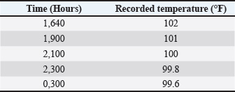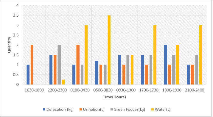 Fig. 1. Record of defecation, urine, green fodder and water intake. Table 1. Record of the temperature.