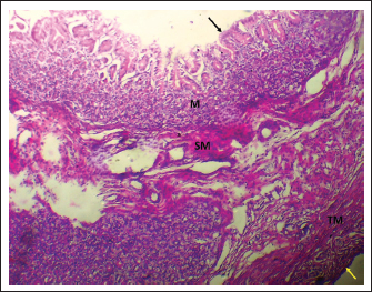 Fig. 1. Shows the four tunics of the cardiac zone in the neonatal dog: Mucosa (M), epithelium (black arrow), submucosa (SM), muscularis (TM), and serosa (red arrow). H&E stain X40.