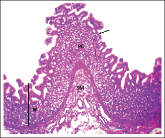 Fig. 6. Shows the pyloric zone in a neonatal dog: Mucosa (M), epithelial (black arrow), plica circularis (PC), submucosa (SM). H&E stain X40.