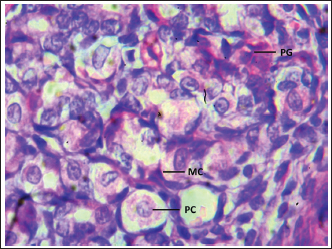 Fig. 8. Shows the pyloric glands in a neonatal dog: Pyloric glands (PG), mucous cell (MC), and parietal cell (PC). H&E stain X400. DiscussionIn newborn dogs, the gastrointestinal tract is simple and monogastric and resembles that of other carnivores such as cats (Salih and Hamza, 2022). Compared to that, the stomachs of horses, pigs, and rats both possess glandular and non-glandular regions (Brewer and Cruise, 1994). Neonatal canine stomach mucosal lining possesses longitudinal folds in all regions, which facilitate gastric distension when large amounts of food are ingested. The folds are also more pronounced when the stomach is in a fasting state, similar to that mentioned in the case of the Grey Mongoose (Hussein and Kadhim, 2019). In neonatal dogs, simple columnar epithelium lined the gastric wall of the three parts of the stomach. Such epithelium is characteristic of carnivorous animals, as reported by Zahariev et al. (2010) in the adult dog. The stomach in herbivorous animals is typically multilocular and glandular, with glandular portions lined by simple columnar epithelium and non-glandular regions covered with stratified squamous epithelium (Frandson and Spurgeon, 1992). Mucous and parietal cells appeared in the cardiac and pyloric regions of the newborn dog stomach, but not chief cells. On the other hand, the fundic zone contained mucous, parietal, and chief cells, which is a pattern characteristic of this development stage from a dietary physiology point of view. This is concordant with those occurring in neonatal cats (Salih and Hamza, 2022). The gastric glands were also discovered to be present at varying depths in the lamina propria, and in the cardiac area, they were present in the form of short, branched tubular structures with related elongated crypts, a feature comparable to that described in cat and dog by Imai et al. (1990). The fundic glands presented as simple, branched tubular structures containing chief cells and parietal cells. The presence of these types of cells signals the ongoing processes of digestion that occur in this part of the stomach and which form its largest functional area. This parallels with findings of Beasley et al. (2015), which gastric acidity is usually stronger in omnivorous and carnivorous animals than in herbivores. In the pyloric area, gastric pits were considerably deeper compared to what was observed in domestic animals’ cardiac and fundic areas. However, this structural aspect differs from Hussein and Kadhim (2019) description of the Grey Mongoose’s stomach. ConclusionThis study elucidates the histological organization of the neonatal dog stomach, with special focus on the unique structural and cellular features dividing the cardiac, fundic, and pyloric areas. Each region was seen to possess specific gland patterns and epithelial compositions in keeping with its primary functional role in digestion. The dominance of mucous-secreting cells in the cardiac and pyloric areas suggests a protective and lubricating role, and the richness of differentiated parietal and chief cells in the fundic area suggests initiation of secretory activity needed for protein digestion. Regional variations of quantitative differences in mucosal and muscular thickness further underscore mechanical and secretory-related specialization. In conclusion, the neonatal dog’s stomach histological organization is that of all young carnivores and reflects an adaptive maturation of structure to accommodate the progressing development of autonomous digestive function. The results provide a required anatomical and developmental foundation for the ensuing comparative analysis of carnivore mammals’ gastrointestinal physiology. AcknowledgmentThe author extends sincere appreciation to all members of the Anatomy and Histology Department staff of the College of Veterinary Medicine, University of Baghdad, for their kind help. Conflict of interestI declare that there are no competing interests. FundingNo specific grant was obtained from a particular funding agency for this research. Authors’ contributionsAll authors have read and approved the final draft of the manuscript. BPM collected and analyzed the data. HLS verified and interpreted the experimental results. APB supervised the experiment. BPM and NDD conceptualized the manuscript. ZZ developed the study design. BA, RM, CH, and RR validated the experimental design and contributed to manuscript revision. Data availabilityThe data supporting this research is not publicly available as it is sensitive in nature, but can be made available by the corresponding author on reasonable request. ReferencesAl-Araji, H.M. and Mohammed, H.H. 2023. Morphologic and morphometric study of lungs in adult indigenous Peafowl (Pavo cristatus). Iraqi. J. Vet. Med. 47(1), 74–79. Al-Saffar, F.J. and Al-Samawy, E.R.M. 2016. Histomorphological and histochemical study of the stomach of domestic pigeon (Columba livia domestica). Iraqi J. Vet. Med. 40(1), 89–96. Alvares, E.P. 1994. Extensive networks of TMPase positive basal lysosomes are present in fetal rat gastric epithelium before overt differentiation. J. Submicrosc. Cytol. Pathol. 26(4), 515–523. Bacha Jr, W. and Wood, L.M. 1990. Color atlas of digestive system. veterinary histology. Bacha, AP: Williams and Wilkins Scientific Publishers, pp. 111–150. Bancroft, J.D. and Gamble, M. eds., 2008. Theory and practice of histological techniques. Elsevier health sciences. Barone, R. 1986. Anatomie comparée des mammifères domestiques–Tome 1: Ostéologie–. Vigot Freres, Paris, pp. 342–356. Beasley, D.E., Koltz, A.M., Lambert, J.E., Fierer, N. and Dunn, R.R. 2015. The evolution of stomach acidity and its relevance to the human microbiome. PLos One 10(7), e0134116. Brewer, N.R. and Cruise, L.J. 1994. The Guinea pig heart--some comparative aspects. Contemp. Top. Lab. Anim. Sci. 33(6), 64–67. Cavalcante De Sousa, M.M.A., Fonseca, C.M.B., Mendonça, T.G.S. and Júnior, A.M.C. 2021. Structur