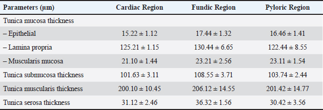 Pyloric zoneThe pyloric region was characterized by short, straight, unbifurcating folds that overlapped invaginations of the gastric crypts. Pits in this region were deeper than those in the cardiac and fundic regions. The lining was made up of simple columnar epithelium with an epithelial height of 16.46 ± 1.41 µm (Fig. 6) (Table 1). The lamina propria contained vascular connective tissue disseminated with pyloric glands (Fig. 8). The lamina propria thickness was 122.44 ± 8.55 µm, and the mean number of pyloric glands was 20.71 ± 2.66 (Tables 1 and 2). Beneath the lamina propria, the muscularis mucosa was composed of smooth muscle fibers organized into inner circular and outer longitudinal layers, with a mean thickness of 23.11 ± 1.54 µm (Fig. 7). Tunica submucosa was constituted of loose connective tissue containing blood and lymphatic vessels, collagen fibers, fibroblasts, and adipocytes. The muscularis externa contained two layers of smooth muscle fibers: an inner thick circular layer and an outer thinner longitudinal layer. The tunica submucosa and muscularis externa thicknesses were 103.74 ± 2.44 µm and 201.42 ± 14.77 µm, respectively (Table 1). The outermost layer was the serosa, which was composed of mesothelium and loose connective tissue with a mean thickness of 30.42 ± 3.56 µm (Table 1). Mucous-secreting cells formed the majority of this cell population, and there were few parietal cells, averaging 0.55 ± 0.87, and chief cells were not present (Table 2). Mucous-secreting cells were pyramidal in shape with basally placed nuclei (Fig. 8).
