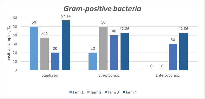 Fig. 2. Quantitative distribution of Gram-positive microorganisms isolated from Blatta orientalis across different pig farms. As shown in the summarized data in Figure 3, Escherichia coli was the predominant microbial isolate recovered from synanthropic cockroaches across all pig farms, followed by Staphylococcus spp., Streptococcus spp., and Enterobacter spp.