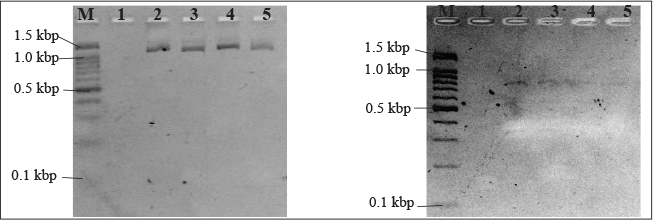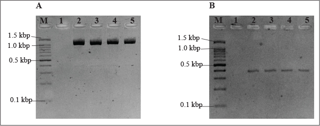 Fig. 2. PCR assay detection of P. fluorescens protease (aprX) and biofilm related (fliC) genes. A. PCR using P. fluorescens aprX-F and aprX-R primers giving PCR product of 1.43kbp. B. PCR using P. fluorescens fliC-F and fliC-R primers giving PCR product of 755 bp. Lanes M, 100 bp markers; lane 1, negative control; lane 2, positive control; lanes 3-5, DNA extract from chicken meat samples.