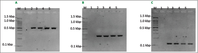 Fig. 3. PCR assay of P. aeruginosa virulence (oprL, lasB and exoS) genes. A. PCR using P. aeruginosa oprL-F and oprL-R primers giving PCR product of 504 bp. B. PCR using P. aeruginosa lasB-F and lasB-R primers giving PCR product of 284 bp. C. PCR using P. aeruginosa exoS-F and exoS-R primers giving PCR product of 118 bp. Lanes M, 100 bp markers; lane 1, negative control; lane 2, positive control; lanes 3-5, DNA extract from chicken meat samples.