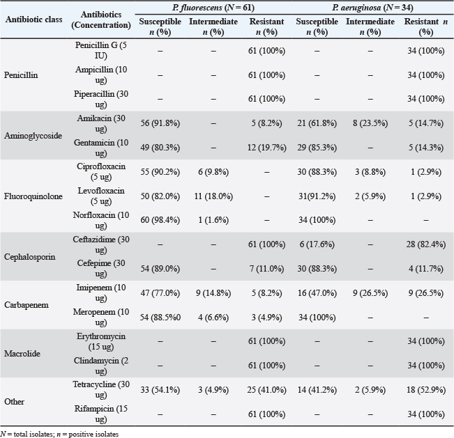 Table 5. Antimicrobial profiles of P. fluorescens (N=61) and P. aeruginosa (N=34).