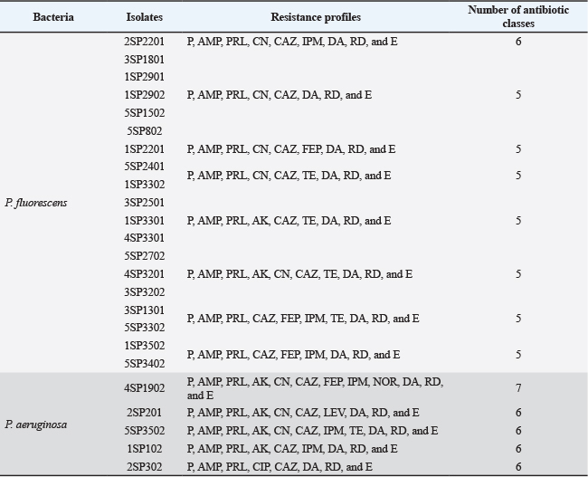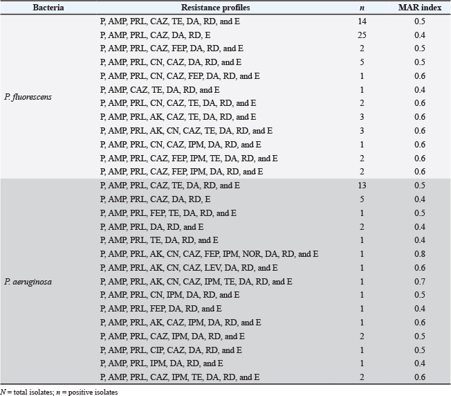 Table 6. Antibiotic resistance profiles and MAR index of P. fluorescens (N=61) and P. aeruginosa (N=34) isolates.