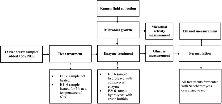 Methods: A factorial experiment was performed with heat (H) and enzyme (E) combinations. The treatment was as follows: (1) no heat and commercial enzyme (H0E1), (2) heat and commercial enzyme (H1E1), (3) no heat and buffalo rumen enzyme (H0E2), and (4) heat and buffalo rumen enzyme (H1E2) with three replications. The enzyme activity, glucose, and ethanol levels were measured.